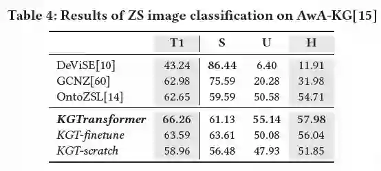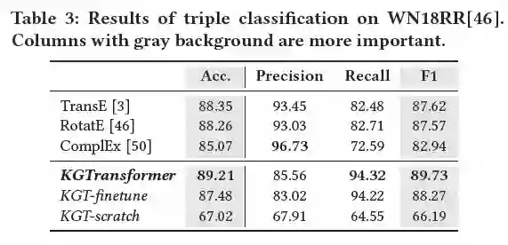 2.3 实验验证我们在由wn18rr, fb15k-237,codex组成的WFC数据集上对KGTransformer层进行了预训练,并将其应用于三种任务中,包括三元组分类、零样本图片分类、问答,每种任务所使用的任务图谱均不一样。下面为三种任务的实验效果实验1:三元组分类实验效果 实验2:零样本图片分类实验效果