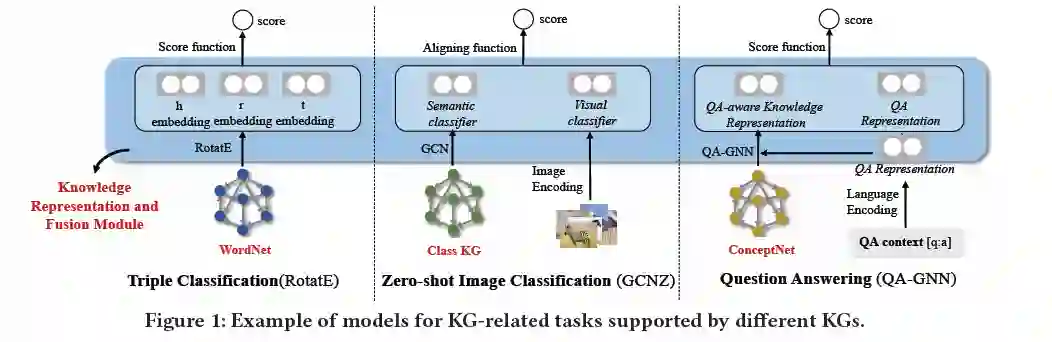 2.1 动机知识图谱(KG)以(头实体、关系、尾实体)的形式将事实表示为三元组,简称(h,r,t),这是一个用于存储世界上常见知识,例如(地球、位置、内太阳系),的存储方式。近年来,已经构建了Wididata、YAGO和NELL等多个大规模知识图谱,并将其作为背景知识提供者应用于机器学习任务中,如问答、图像分类、视觉推理等。在为与知识图谱相关的任务设计模型时,关键任务之一是设计知识表示与融合(KRF)模块,该模块从知识图谱中学习元素的表示,并将其与任务表示融合。如图1所示,知识图谱补全模型RotatE通过对复数空间中的实体和关系进行嵌入学习来表示KGs中的知识,并通过得分函数计算三元组的真值。零样本图像分类模型GCNZ使用图卷积网络和ResNet分别学习知识图谱和图像的表示,并通过对齐分类器在知识图谱表示和图像表示上的结果来融合它们。基于知识的问答模型QA-GNN首先对query-kg图进行编码,并将表示与查询表示融合以进行预测。由于需要考虑的知识图谱和视角的不同,在知识图谱相关的任务模型中,KRF模块也存在差异,这给临时的KRF模块设计留下了重复的工作。