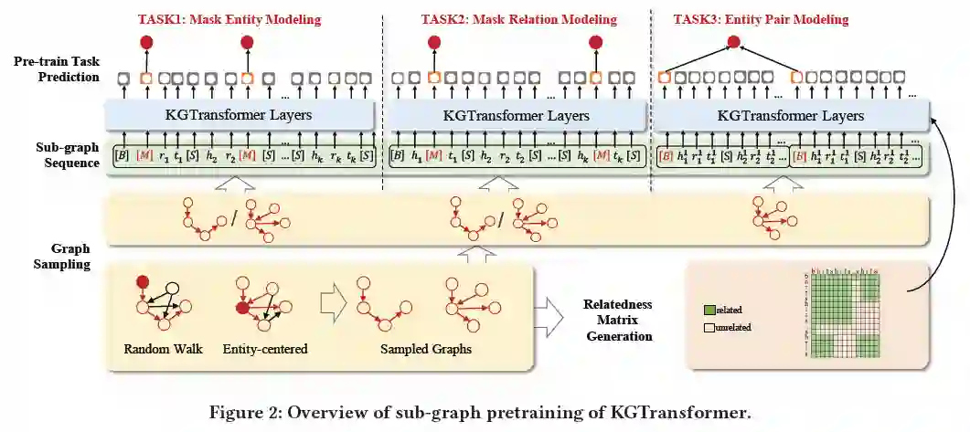2.2 方法KGTransformer由多个KGTransformer层组成。该模型以采样的子图的三元组序列作为输入。在KGTransformer层中,根据三元组元素之间的邻接矩阵,允许序列中不同元素进行有限的交互,即具有相同元素(实体或关系)的三元组,在Transformer结构中是可见的。在训练阶段,本文提出一种具有三个自监督任务的子图预训练方法,即掩码实体建模、掩码关系建模和实体对建模。 在下游任务阶段,KGTransformer层中的参数𝜃M有助于将与特定实体和关系无关的图结构知识从预训练KG转移到任务KG。本文提出一种通用的提示调优机制,将每个任务样本作为一个连接在任务KG序列末尾的提示。最后,我们从最后一个KGTransformer层取出一些隐藏状态,并将它们输入到任务层进行预测。此阶段KGTransformer层参数𝜃M被冻结,以保持与预训练期间学习的特定实体和关系无关的图结构知识。