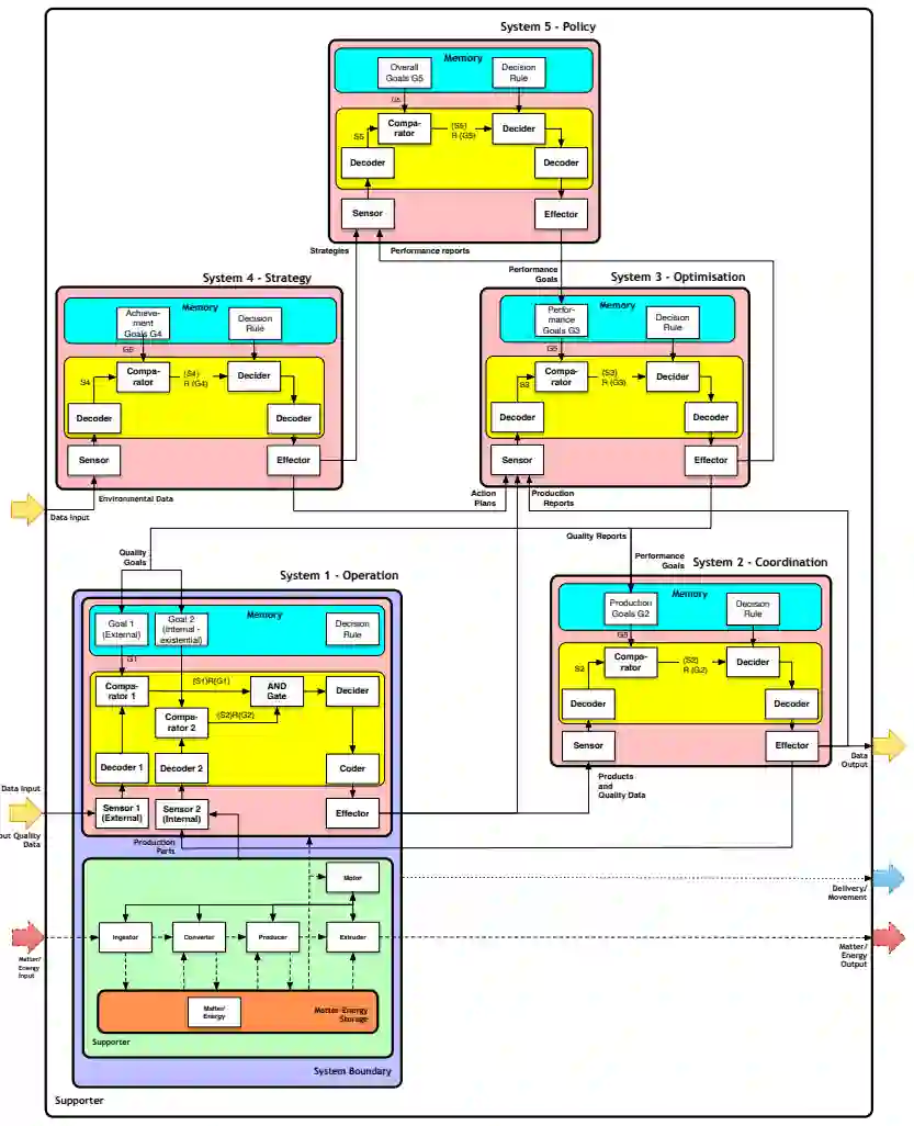 Nechansky 将 Beer 和 Miller 的两种理论进行了综合[如见 20、21、22、23、24、25、26],旨在克服两种理论侧重不同细节的困境。Nechansky 提议根据 Miller 的 LST [23],将 Beer 的数据处理结构转化为面向目标系统的功能和结构方法。
