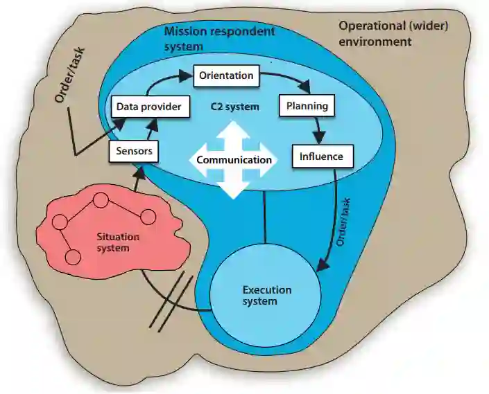 指挥与控制(C2)作为一个术语,在许多方面都是一个二分法,它指向组织管理任务中两个相互矛盾的方面。首先,它指向行使指挥权的创造性过程。其次,它指出了既制约指挥又使指挥成为可能的结构、规则和关系。指挥员要想提高效率,不仅要有能力应对手头的问题,还必须了解、有时甚至克服作为其所要指挥的组织基础的控制结构。无论控制结构是如何设计和实施的,一个军事组织都必须具备基本的 C2 功能,才能发挥作用。军事领域的一些思想家提出了这些功能的建模方法,如博伊德的观察-定向-决策-行动循环(又称 "OODAloop")[1, 2]、布雷默的动态-观察-决策-行动循环(又称 "DOODA loop")[3, 4, 5]、劳森的指挥与控制模型[6]等。几乎所有这些模型都包含以下 C2 功能:监控、感知(此处等同于布雷默晚期定义的定向)、决策/规划和执行/行动。在这些功能中,定向和决策功能一直是众多研究的主题[例如,见 3、4、7]。