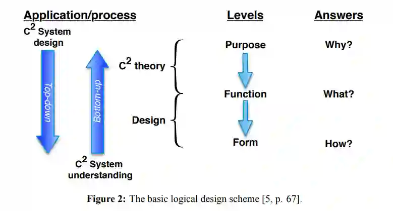 由子系统组成的 C2 系统与 Brehmer 关于设计逻辑的讨论有关[7,第 212 页]。由此,Brehmer 认为,C2 系统的设计基本上是一个自上而下的过程,首先要确定设计该系统的目的。下一步是描述系统应实现的目标,即系统实现目标所需的不同功能。最后,布雷默提出,设计的最后一步是通过考虑如何实现系统的功能来描述系统的形式。布雷默还强调,该方案可自下而上地用于理解现有系统的运行方式[5](图 2)。