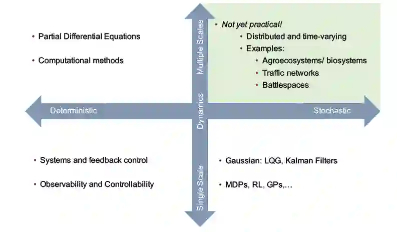 图1.1:对具有复杂不确定动态特性的系统进行建模、监测与控制,是控制学界亟待突破的开放性挑战。左下象限描述具单尺度动态的线性时不变系统(传统动态系统反馈控制理论足以应对);右下象限展示随机单尺度系统(卡尔曼滤波器与高斯优化等方法已获显著成功,支撑登月至GPS导航等成就);左上象限表征多尺度动态系统(偏微分方程高效求解是研究热点);而右上象限所示多尺度随机信息物理系统(如分布式农业机器人系统、交通网络、移动/固定传感器气象监测系统)的自主决策,仍需基础理论突破与实践算法创新。
