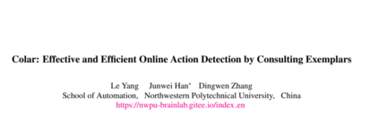 杨乐,韩军伟,张鼎文. Colar: Effective and Efficient Online Action Detection by Consulting Exemplars, CVPR 2022.