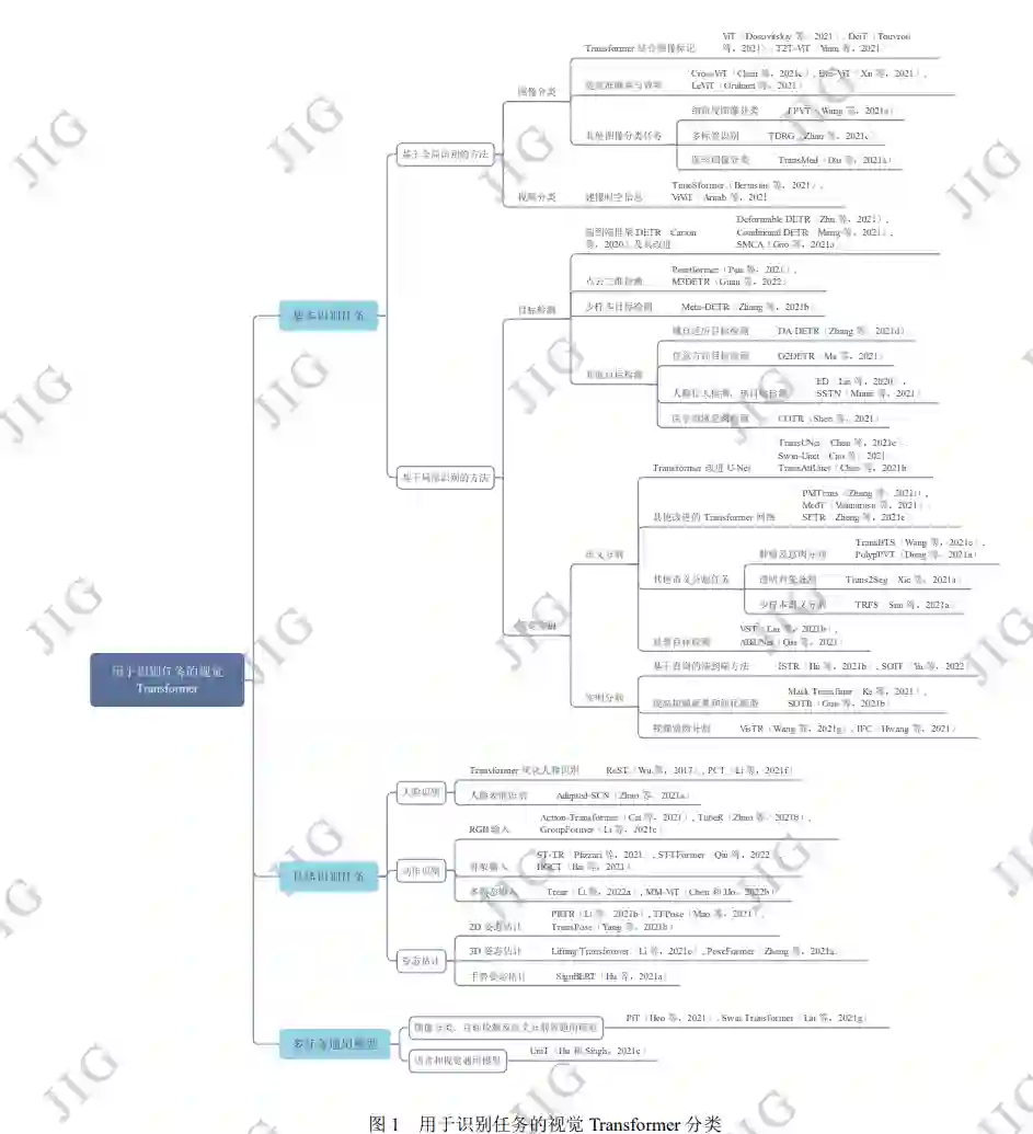 http://www.cjig.cn/jig/ch/reader/view_abstract.aspx?edit_id=20230216101300001&flag=2&file_no=202208300000009&journal_id=jig 计算机视觉(Computer Vision, CV)涉及对图像 或视频中有用信息的提取和分析。在所有CV任务中, 识别任务占有很大的比重。随着深度学习技术的引 入,经典的方法是利用卷积神经网络(Convolutional Neural Network, CNN)来解决此类问题。CNN通过局 部感知和参数共享,降低了网络模型的复杂度,并 且可以直接将图像数据作为输入,避免了人工提取 特征的过程。但由于CNN擅长关注局部特征,难以 很好地利用对结果同样十分重要的全局信息,使得 该领域的发展受到了一定的阻碍。 Transformer(Vaswani 等,2017)是一个从序列 到序列(Sequence to Sequence)的模型,最大特点是 抛弃了传统的卷积神经网络和循环神经网络 (Recurrent Neural Network, RNN),采用注意力机制 组成网络,使得模型可以并行化训练,而且能够关 注全局信息。Transformer被提出后在自然语言处理 (Natural Language Processing, NLP)领域大放异彩,例如备受关注的基于Transformer的双向编码器表 示 (Bidirectional Encoder Representations from Transformers, BERT)模型(Devlin 等,2019),以及 生成式预训练Transformer(Generative Pre-Training, GPT) 系列模型 GPT1(Radford 和 Narasimhan , 2018),GPT2(Radford 等,2019),GPT3(Brown 等, 2020)。 这些基于Transformer的模型表现出的强大性 能使NLP研究取得了重大突破,同时吸引住了计算 机视觉研究人员的目光,他们将Transformer移植到 视觉任务中,并发现了其中的巨大潜力。 如首次使 用 纯 Transformer 进行图像识别的方法 Vision Transformer(ViT)(Dosovitskiy 等,2021),以及解决 目标检测问题的Detection Transformer(DETR)模型 (Carion 等,2020)。 随着越来越多的视觉Transformer模型被探索 出来,关于此研究的综述文章也逐渐出现。按照分 类标准的不同,目前的综述文章从不同的角度总结 现有的方法,包括输入数据(Han 等,2020)、网络 结构(Khan 等,2022)、应用场景(Liu 等,2021f, Liu 和 Lu,2021d,Khan 等,2022)。其中,从应 用场景角度进行总结的文章占大多数。Liu 等人 (2021f)分别从计算机视觉领域的三个基础任务(分 类、检测、分割)总结现有的方法。除了这三个基础 任务外,Liu 和 Lu(2021d),Khan 等人(2022)又增 加了在识别、视频处理、图像增强和生成应用场景 下的方法总结。然而,这些不同的应用都是孤立存 在的,不能形成一个系统的各种方法的总结。此外, 现有的综述文章多关注于视觉Transformer模型与 传统的CNN模型结果的比较,对不同Transformer模 型间结果的比较分析较少。 为了解决以上问题,本文从视觉识别的角度出 发,总结比较了视觉Transformer处理多种识别任务 的代表性方法。按照识别粒度的不同,可以分为基 于全局识别的方法和基于局部识别的方法。基于全 局识别的方法,即对视觉数据(图片、视频)整体进行 识别,例如图像分类、视频分类。基于局部识别的 方法,即对视觉数据中的部分进行识别,例如目标 检测等。考虑到现有方法在三种具体识别任务的广 泛流行,本文也总结对比了在人脸识别、动作识别 和姿态估计三种识别任务的方法。在每类任务下, 对不同方法的特点和在公共数据集上的表现进行 了对比分析,并进一步总结了该类方法的优点与不 足,以及不同识别任务面临的问题与挑战。 本文与现有的综述文章对比,具有以下优点: 1)本文从识别的角度分类,可以更系统地将现有方 法联系起来;2)虽然一些综述文章(Liu 和 Lu, 2021d,Khan 等,2022)也对识别任务的方法进行了 总结,但是涉及的内容不全面,而本文不但对基础 识别任务的方法进行了总结,还总结了三种具体识 别任务的方法,并且对于每类任务方法,在对比分 析公共数据集结果的基础上,总结了其发展现状和 不足。 综上所述,近年来 CNN 的局限性以及 Transformer研究的突破性使得视觉Transformer已广 泛应用于CV领域,而关于视觉Transformer的综述文 章还不够丰富,特别是对其应用场景的总结存在着 较为孤立的现象。又因流行的CV应用场景大多能够 以视觉识别的角度分析,所以本文系统地对用于识 别任务的视觉Transformer进行综述具有必要性,同 时,本文通过每类任务对应的基准数据集上的实验 对比分析,反映各类Transformer模型间的区别与联 系也是十分必要的。最后,本综述的出现带来了更 系统的总结和更全面的内容,将为相关领域读者快 速了解和认识Transformer在视觉识别任务中的应 用提供重要帮助。