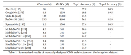 上图报告了ImageNet上自动设计和人工设计CNN模型的总结结果。NAS节省了工程师的人工成本,并提供了比人工设计的CNN更好的模型。除了ImageNet分类,自动设计的CNN模型在目标检测[46,91,278,367]和语义分割[40,184]方面也优于手动设计的CNN模型。
