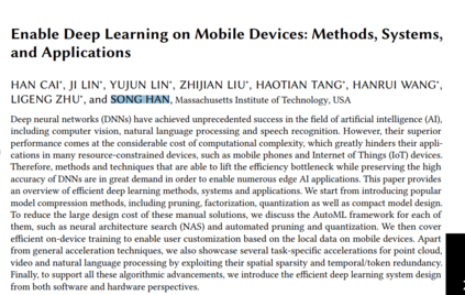 深度神经网络(DNNs)在人工智能(AI)领域取得了前所未有的成功,包括计算机视觉、自然语言处理和语音识别。然而,其卓越的性能是以计算复杂度为代价的,这极大地阻碍了其在许多资源受限设备(如移动电话和物联网设备)中的应用。因此,为了实现大量的边缘人工智能应用,需要在保持DNNs的高精度的同时,提升效率瓶颈的方法和技术。本文综述了有效的深度学习方法、系统和应用。首先介绍了常用的模型压缩方法,包括剪枝法、因式分解法、量化法以及紧凑模型设计。为了减少这些手工解决方案的巨大设计成本,我们讨论了每个解决方案的AutoML框架,例如神经体系结构搜索(NAS)和自动修剪和量化。然后,我们将介绍有效的设备上训练,以支持基于移动设备上的本地数据的用户定制。除了一般的加速技术,我们还展示了几个特定于任务的加速,用于点云、视频和自然语言处理,利用它们的空间稀疏性和时间/令牌冗余。最后,为了支持所有这些算法的进步,我们从软件和硬件两个角度介绍了高效的深度学习系统设计。
