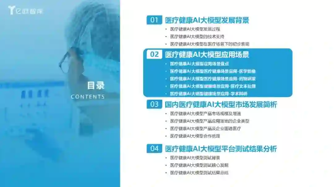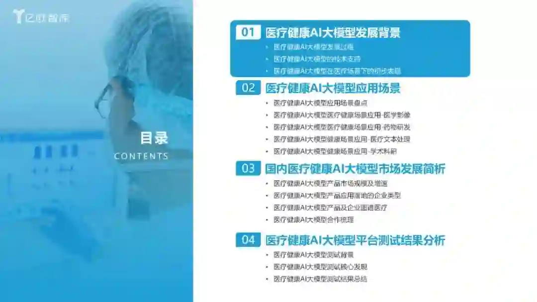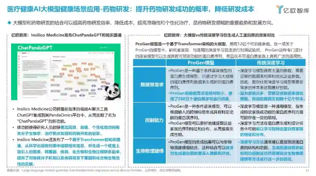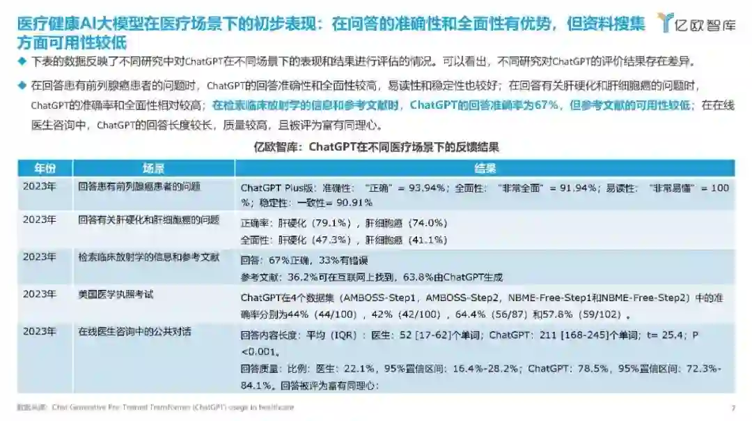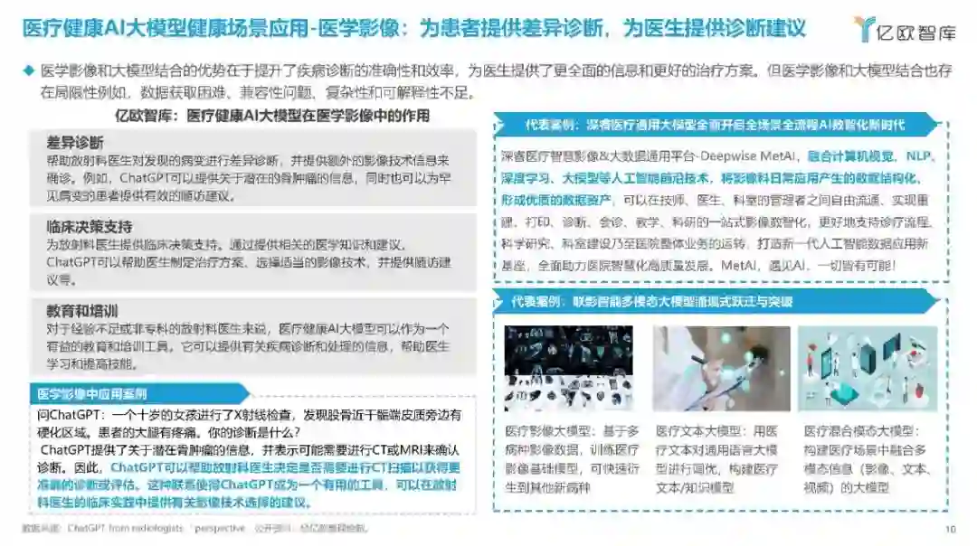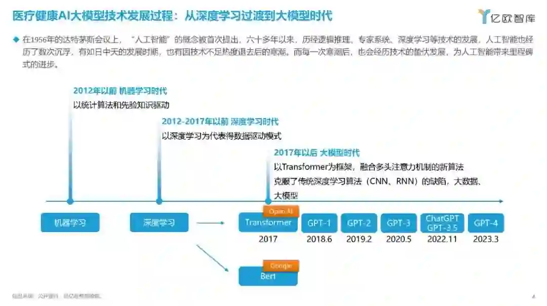 2023年9月,习近平总书记在黑龙江考察调研期间首次提到“新质生产力”,强调整合科技创新资源,引领发展战略性新兴产业和未来产业,加快形成新质生产力。 医疗行业是一个典型的知识和技术密集型行业,其发展水平直接关系到国民健康和生命质量。医疗健康AI大模型,作为人工智能的一个分支,能够通过学习大量的数据来生成新的数据实例,这在医疗领域有着广泛的应用前景,如药物研发、医学影像、医疗文本分析等。这些应用不仅能够提升医疗服务的质量和可及性,还能够推动整个医疗产业的创新发展,形成新的产业生态和生产力。因此,“新质生产力”概念下的科技创新资源整合,对于医疗和生成式AI领域的发展至关重要。 基于此,亿欧撰写了本报告,旨在分析当前医疗健康AI大模型在实际应用中的成效,提高医疗各界对医疗健康AI大模型的认识和理解,讨论其对医疗服务可及性和质量的潜在影响,增强医疗各界对新技术的接受度。 医疗健康AI大模型技术发展过程:从深度学习过渡到大模型时代 在1956年的达特茅斯会议上,“人工智能”的概念被首次提出,六十多年以来,历经逻辑推理、专家系统、深度学习等技术的发展,人工智能也经历了数次沉浮,有如日中天的发展时期,也有因技术不足热度退去后的寒潮。而每一次寒潮后,也会经历技术的蛰伏发展,为人工智能带来里程碑式的进步。 众多高校研发医疗健康AI大模型,为行业发展的技术底座提供了坚实的基础 目前众多高校启动了关于中文医疗健康AI大模型的研发并在Github上发布源代码,增加了商业企业对于医疗健康AI产品研发的技术支持。 从研发模型的功能分析,大多围绕问诊对话、病历结构化等文字处理相关的功能。