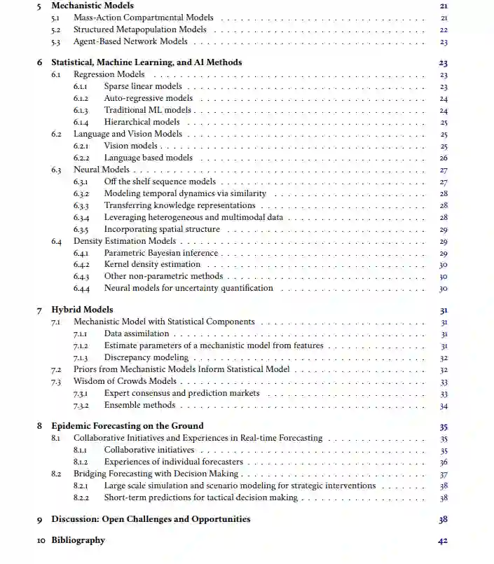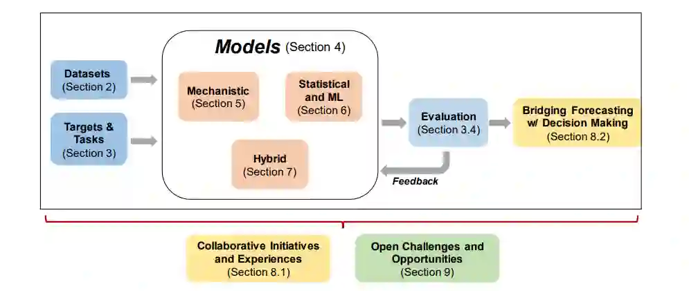 **该综述分为7个部分,**如图2所示。在第2节中,我们讨论用于流行病预测的传统和较新的数据来源。在第3节中,我们描述了预测设置,包括定义预测目标和具体任务。然后我们讨论常用的定量评估指标。然后,我们转向预测建模技术(第4节),我们将其分为机械的、统计的和混合的,并进一步根据它们的关键建模思想对它们进行分类。对于每一种建模技术,我们都将对一些突出的方法进行深入的回顾,从研究良好的机械模型(第5节)开始,然后转向统计模型(第6节),统计模型更灵活地利用大量多样的数据来源,从过去的数据中学习复杂的模式,通常提供更准确的预测。在这里,我们密切关注深度学习创新,这是一个非常活跃的研究领域,有多个最新的例子。在第7节中,我们将描述最近引起人们兴趣的混合模型,并将可解释的、基于理论的机械模型的长期建模能力与更灵活、准确和数据驱动的统计模型结合起来。在第8节中,我们调查了最近的“战壕”行动和利用这些模型进行流行病和大流行预测的经验,讨论了现实部署的挑战,包括根据预测做出决策。最后,在第9节中,我们讨论了与流行病预测管道的各个方面相关的主要挑战和重要的开放研究问题。