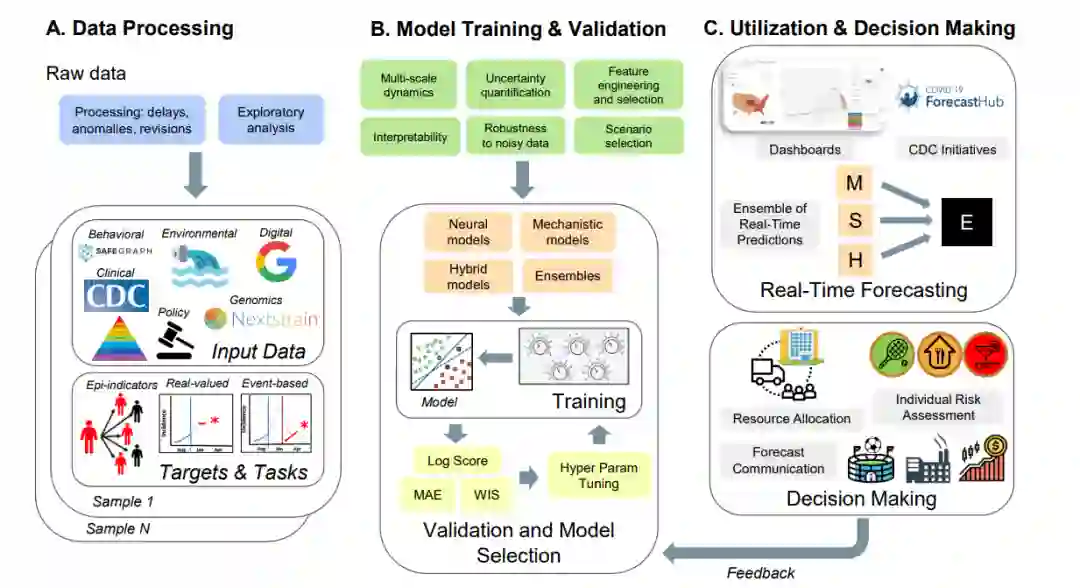 图1: 以数据为中心的流行病预测流程概述。(A)在建模之前,我们需要准备数据,包括收集和探索性分析,以处理数据质量问题。在这个阶段,我们还确定了流行病的目标和任务。(B)模型的制定考虑到流行病传播的多个方面(例如,多尺度动力学)和预测的利用(例如,不确定性量化)。验证和模型选择需要使用定量指标来评估预测的可操作性和可靠性。(C)实时预测有多种用途,包括仪表板、集成组成和其他公共卫生举措。这些活动为资源分配、个人风险评估和公众沟通提供决策平台。