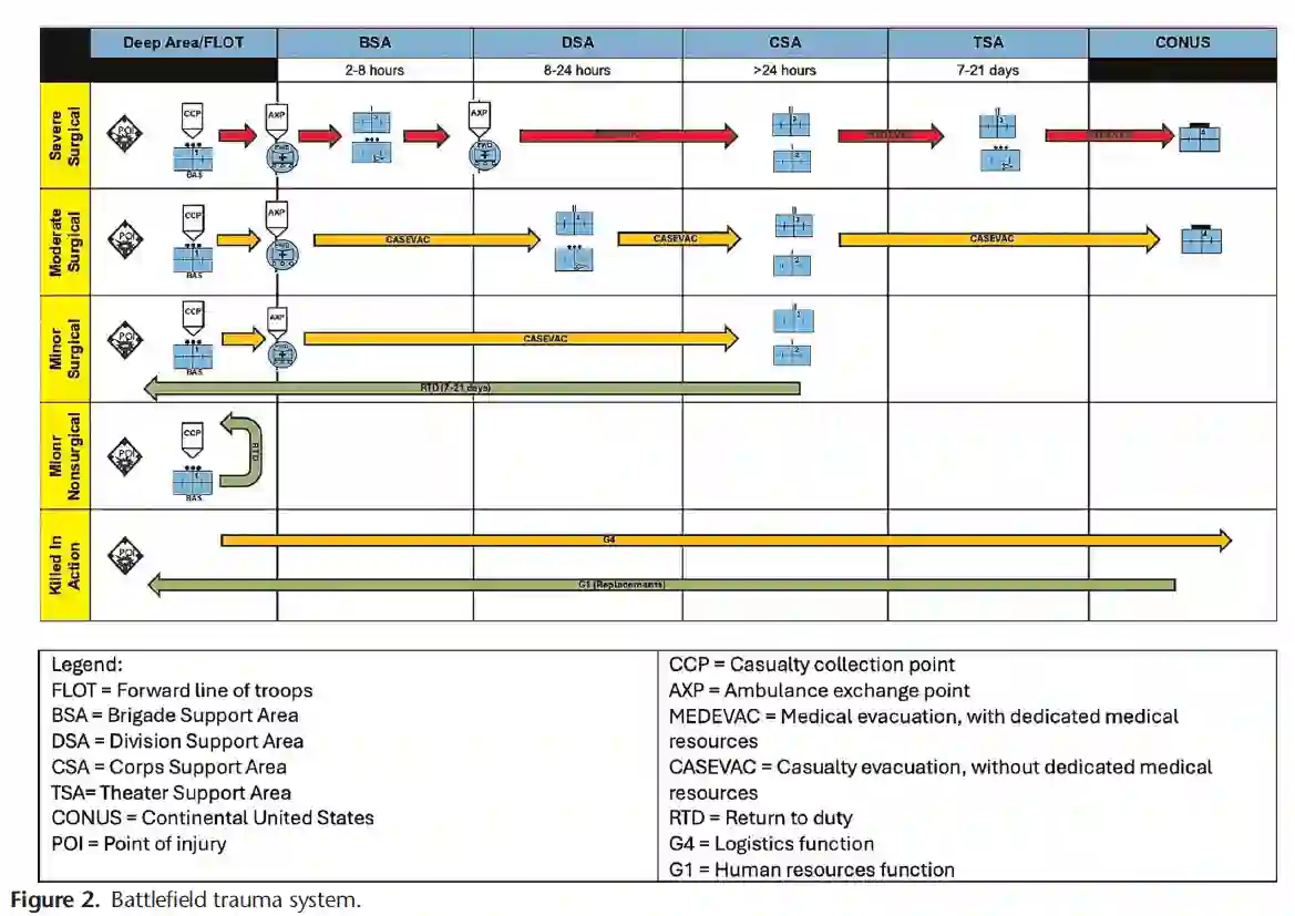 背景:大规模作战行动(LSCO)导致伤亡量激增,对战场创伤救治构成严峻挑战,亟需将医疗行动与作战功能整合的协同方案。现有伤亡管理工具(如医疗规划工具包与联合医疗规划工具)仅提供静态评估,缺乏后送及医疗补给预测能力。自动化战场创伤系统(ABTS)通过实现伤亡分类、资源评估及医疗通用作战图报告的自动化,针对性突破上述局限。