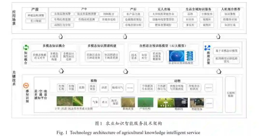 中国农业生产分布广,种植区域、气候、品 种、农艺等差异巨大,光温水土气等环境与作物生 长、病虫害发生的关联机理十分复杂,加之农业生 境、水文、气象等外部条件的不确定性导致科学、 精准的生产决策非常困难[1] ,迫切需要将深度学 习、机器视觉、知识工程、推理决策等新一代人工 智能技术与农业场景深度融合,提升农情研判、预 警防控、环境调控、标准化管理等农产品全生命周 期的综合预测与知识服务能力,实现由“看天而 作”到“知天而作”的转变,通过建立“知识赋 能”的智慧农业应用模式,推动农业产业提质增效 与现代化转型升级[2] 。 当前农业传感器、物联网、智能农机等技术快 速发展,农业生产过程的数据化水平不断提升,农 业知识智能服务通过对这些海量农业数据的采集、 分析和挖掘,提取数据中蕴含的知识和规律,克服 传统方式存在服务效率低、信息过载等缺点,为农 业生产管理提供科学依据,提升农业科技服务的针 对性和质量[3] 。 目前农业生产经营仍对人工经验有着较高的依 赖度,本文从智能化决策替代的角度,充分考虑农 业知识服务中面临的数据低秩化、知识碎片化和关 联复杂度高等现状,从“感知识别”“知识耦合” “推理决策”三个层面进行研究突破,重点解决复 杂不确定环境下的动植物状态识别、多模态数据关联知识抽取与农业多应用场景协同推理等农业知识 智能服务中的关键问题,通过数据、知识、案例联 合驱动,为农业生产用户提供土壤改良、品种选 择、育苗调控、生产管理、水肥药减施、采收决 策、产销对接、品控溯源等全链条知识智能服务。