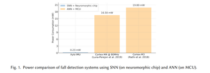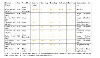 时间序列传感器数据是许多普适计算和机器人应用的基础,涵盖了从使用移动设备和可穿戴设备进行生理健康监测到机器人在动态环境中导航等多个领域。这些应用处理连续的传感器信息流,以做出实时决策【26, 31, 114, 124】,其中的挑战在于平衡推理准确性与资源效率。例如,用于早期检测心血管疾病的可穿戴设备必须处理高频数据流,同时保持电池寿命【179】。类似地,在执行搜救任务的自主机器人需要分析动态的多模态输入,如激光雷达、相机和惯性传感器,同时确保快速响应时间和能源节约【172】。这些场景突显了对于数据处理技术的关键需求,即能够处理流式传感器数据,且在确保准确性的同时具有计算效率,从而能够在资源受限的普适设备上持续执行。 近年来,机器学习模型,特别是像递归神经网络(RNNs)、长短时记忆网络(LSTMs)、卷积神经网络(CNNs)和变换器(Transformers)这样的深度学习架构,在从时间序列数据中提取有意义的模式方面展示了巨大的潜力,有效减轻了来自上下文噪声的干扰【142】。然而,这些模型通常计算密集,可能不适合在资源受限设备上进行实时推理。为此,研究人员探索了各种策略,以适应深度学习模型在普适系统中资源有限的特点,包括模型压缩技术(如剪枝【89, 102, 119, 128, 143】、量化【88, 162, 210】和知识蒸馏【14, 91, 162】)、轻量级架构【94, 193, 235】和低功耗优化【110, 155, 177】。 尽管有这些努力,传统的人工神经网络(ANNs)在有效监控普适计算环境中的上下文方面仍然面临重大挑战。这些挑战主要来源于两个关键因素:(1)离散信息处理——人工神经网络以离散块的方式处理信息,通常会在特定时间段内聚合传感器数据(称为“检测窗口”),并独立处理每个块,而不考虑跨块的时间依赖关系。为了避免漏检,连续窗口通常会重叠,从而导致相同数据被多次处理,增加了计算和能源开销。(2)连续值表示——人工神经网络通常处理连续值数据,通常以浮动点数的形式表示。这种表示方法,加上大量的模型参数和激活函数,会导致显著的能源消耗和内存开销。 相比之下,脉冲神经网络(SNNs)提供了一种根本不同的、生物启发的神经计算模型,能够帮助克服这些挑战【82】。具体来说,SNNs通过使用离散脉冲进行通信和计算,模拟人脑中神经元的行为。与连续值表示不同,脉冲是轻量级的,仅需一个位的信息(1 或 0)。此外,SNN神经元随着时间积累信息,仅在必要时才生成脉冲,从而减少了计算负载和能源消耗。例如,如图1所示,我们实验发现,使用SNN进行跌倒检测(在类脑硬件上实现)时的功耗显著低于使用人工神经网络(在传统微控制器(MCUs)上实现)的功耗(减少了71倍)。这种事件驱动的处理范式与传感器数据的时间性和动态特征高度契合,仅需处理发生在不规则时刻的显著事件或变化。此外,SNNs可以自然地编码时间信息,使其特别适合涉及时间依赖数据和实时数据流的任务【136】。 近年来,SNNs因其卓越的能效和实时处理能力,受到了显著关注,并被视为资源受限和时间敏感应用的有前景的新方向。例如,近期的研究集中于:(a)改进SNN模型训练和架构设计【50, 129】;(b)设计和实现旨在以最小功耗执行不同规模SNN模型的能效类脑硬件【137】;(c)在各种可穿戴和移动应用中应用SNN模型,如手势识别【174】和生理监测【21】,以支持资源受限的低端设备上的持续实时操作。在这些进展的基础上,几篇文章系统性地回顾了SNN的广泛研究领域(总结见表1,按全面性组织),面向机器学习社区。具体来说,许多综述文章提供了SNN组件的全面基础概述,如神经元模型【65, 173】、编码方案【65, 166】和训练方法【35, 49, 65, 154, 160, 166, 173, 199, 217】,为有兴趣从事SNN开发的研究人员提供了通用的理论介绍。一些综述还对SNN的实现所需的软件【173, 217】和硬件【35, 166, 173】平台进行了分类。然而,由于SNN研究的快速发展,一些讨论的平台现在已经过时或不再维护。与此同时,最近的硬件和软件发展提供了更好的支持,适用于实时、低功耗的SNN应用,但尚未得到全面回顾。此外,这些综述中的大多数主要关注图像或视觉数据,只有少数(如【166, 173】)简要涉及时间序列数据。尽管SNNs因其固有的建模和利用时间动态的能力,特别适用于时间序列数据,但现有的综述中没有强烈关注时间序列作为一种模态,这一点在普适计算的背景下尤为局限,因为时间序列传感器数据是核心模态。 因此,在本综述中,我们旨在将SNNs引入到移动感知和普适计算社区,特别关注时间序列数据。对于该社区来说,时间序列传感器数据的高效处理至关重要,而SNNs固有的时间动态和能效特性将使其受益匪浅。为了填补现有SNN综述在普适应用方面的不足,我们回顾了76篇同行评审的文章,涵盖了计算神经学、上下文感知和类脑硬件等多个领域。我们根据与实际应用案例的相关性对这些文献进行了分类,并分析了基于SNN的处理如何与这些需求相契合。接着,我们提供了针对时间序列理解的SNN核心组件(如神经元模型、编码方案和训练方法)的定制概述。 此外,我们为有兴趣进入该领域的研究人员提供了可操作的指导和资源,包括对最新软件库和硬件平台的全面回顾。我们根据它们提供的支持类型(如仿真/开发)以及与特定硬件平台的兼容性,对近期的软件工具链进行了分类回顾。在硬件方面,我们根据平台对网络规模、低功耗操作