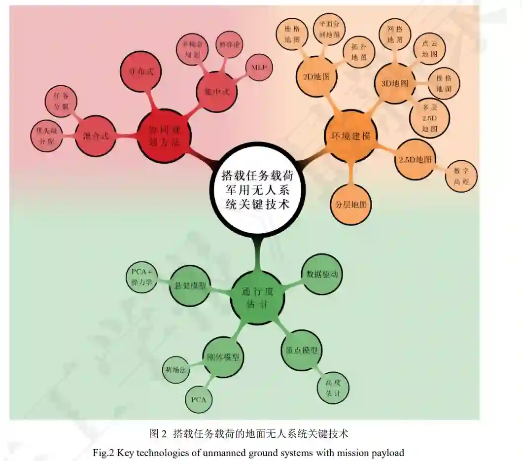 随着军用地面无人系统研究的深入,单一的地面无人机动平台或任务载荷很难满足现代战场的需求,只有任务载荷和机动平台协同发展,地面无人系统才能在战场中真正形成战斗力。为进一步推动任务载荷与机动底盘协同技术的发展,综述了搭载任务载荷军用地面无人系统的发展背景、研究现状及技术特点,分别从多层次多维度的环境建模、基于多模态数据的通行度估计、基于多智能体协同建模的协同规划控制优化方法三方面对其关键技术进行阐述,总结了相关的研究框架和重点,并对搭载任务载荷军用地面无人系统未来的发展方向进行了展望。