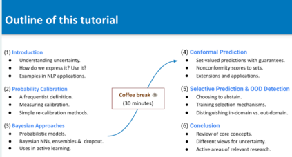 在自然语言处理(NLP)中,不确定度的准确估计对于许多困难或敏感的预测任务非常重要。尽管大规模的预训练模型极大地提高了整个领域应用机器学习模型的准确性,但仍有许多情况下它们失败了。精确量化不确定性的能力,在处理现代模型在现实世界中部署时可能面临的挑战场景时,对于可靠的、结果性的决策是至关重要的。本教程面向学术研究人员和行业从业者,全面介绍了NLP问题的不确定性估计——从概率校准的基本原理、贝叶斯推断和置信集(或区间)构建,到现代分布失衡检测和选择性推断的应用主题。