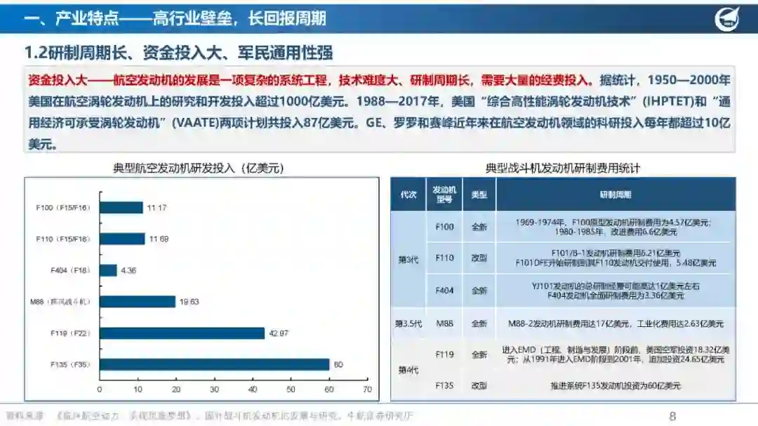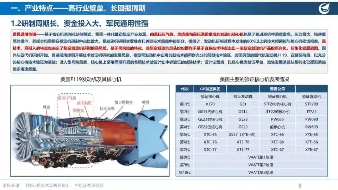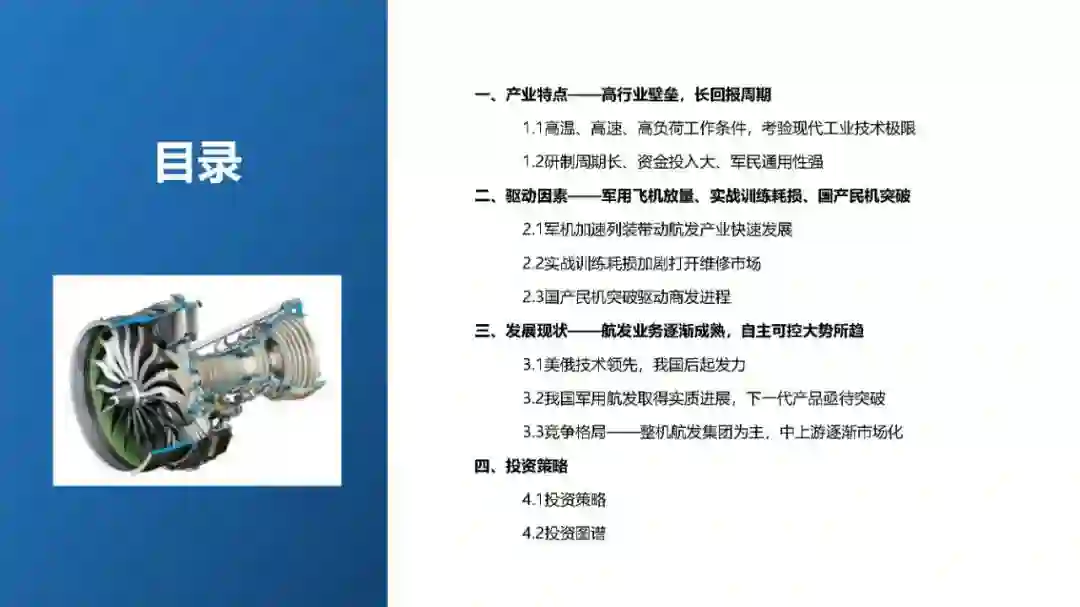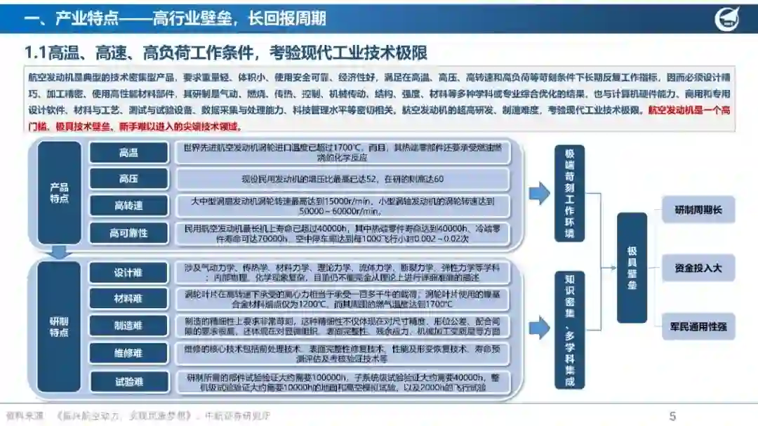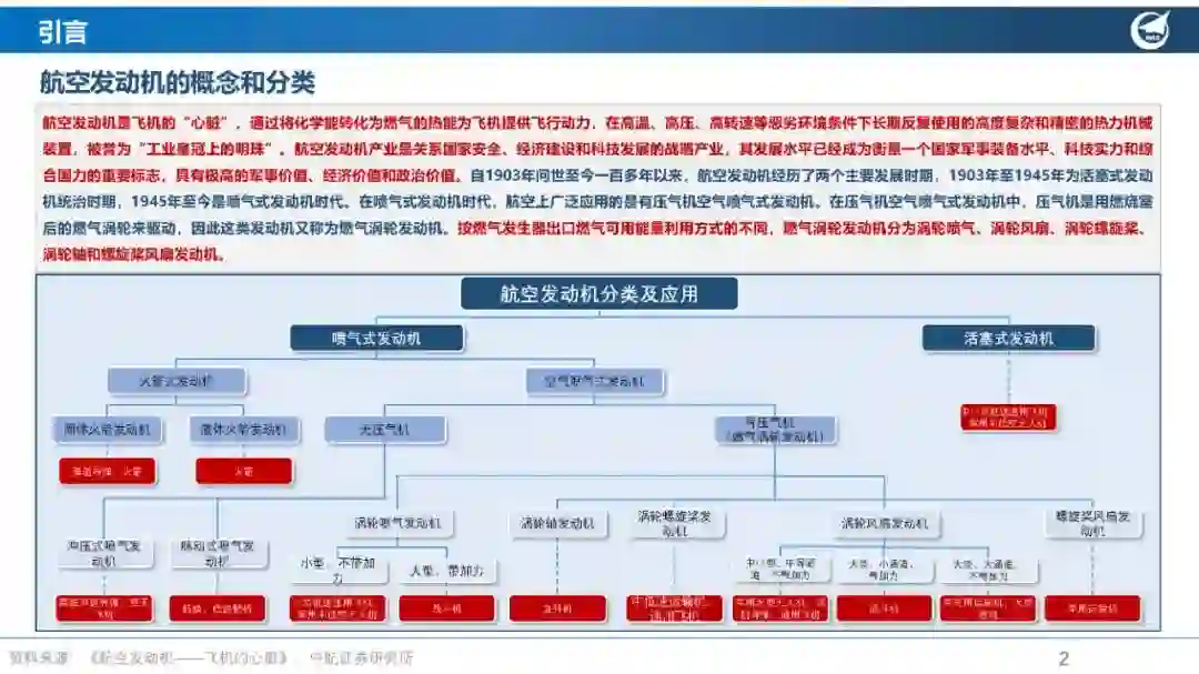 航空发动机是飞机的“心脏”,通过将化学能转化为燃气的热能为飞机提供飞行动力,在高温、高压、高转速等恶劣环境条件下长期反复使用的高度复杂和精密的热力机械装置,被誉为“工业皇冠上的明珠”。航空发动机产业是关系国家安全、经济建设和科技发展的战略产业,其发展水平已经成为衡量一个国家军事装备水平、科技实力和综合国力的重要标志,具有极高的军事价值、经济价值和政治价值。自1903年问世至今一百多年以来,航空发动机经历了两个主要发展时期,1903年至1945年为活塞式发动机统治时期,1945年至今是喷气式发动机时代。在喷气式发动机时代,航空上广泛应用的是有压气机空气喷气式发动机。在压气机空气喷气式发动机中,压气机是用燃烧室后的燃气涡轮来驱动,因此这类发动机又称为燃气涡轮发动机。按燃气发生器出口燃气可用能量利用方式的不同,燃气涡轮发动机分为涡轮喷气、涡轮风扇、涡轮螺旋桨、涡轮轴和螺旋桨风扇发动机。 涡轮风扇发动机是当前航空发动机的主流。涡扇发动机由于其推力大、推进效率高、耗油率低等特点,广泛应用于战斗机、运输机、客机、无人机,占比在95%以上,是目前最为广泛的航空发动机。涡扇发动机内部结构主要由风扇、压气机、燃烧室、涡轮和尾喷管等部件组成。其工作原理为:外界空气进入发动机后,由风扇叶片进行初步压缩,压缩后的空气一部分进入外涵道高速排出,产生巨大推力。另一部分则进入内涵道,由压气机叶片进一步压缩后送至燃烧室。增压后的空气在燃烧室中与燃料混合加热,产生高温、高压燃气推动涡轮叶片高速旋转以带动压气机,随后气流经涡轮出口进入尾喷管,在此过程中压力降低、速度增加,从而产生反作用力,推动飞机前进。