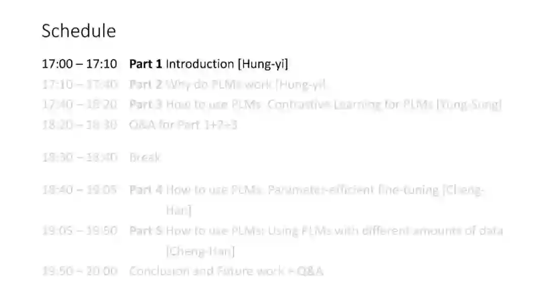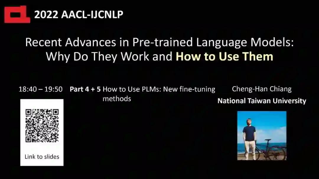 预训练语言模型(PLMs)是在大规模语料库上以自监督方式进行预训练的语言模型。在过去的几年中,这些PLM从根本上改变了自然语言处理社区。**在本教程中,我们旨在从两个角度提供广泛而全面的介绍:为什么这些PLM有效,以及如何在NLP任务中使用它们。**本教程的第一部分对PLM进行了一些有见地的分析,部分解释了PLM出色的下游性能。第二部分首先关注如何将对比学习应用于PLM,以改进由PLM提取的表示,然后说明如何在不同情况下将这些PLM应用于下游任务。这些情况包括在数据稀缺的情况下对PLM进行微调,以及使用具有参数效率的PLM。我们相信,不同背景的与会者会发现本教程内容丰富和有用。
