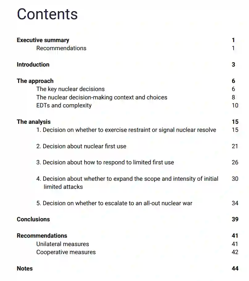 新兴技术和颠覆性技术(EDTs)之间复杂的相互作用会对核决策产生重大影响,尤其是在地区常规冲突不断升级的情况下。此类冲突可能会给政府带来一系列核决策:是否在危机中引入核因素,是否通过有限的核使用跨越核门槛,如何应对有限的核攻击,是否扩大最初有限攻击的范围和强度,以及是否升级为全面核战争。在每个决策点上,EDT 都会带来潜在的风险和回报。