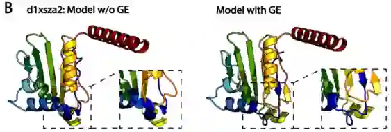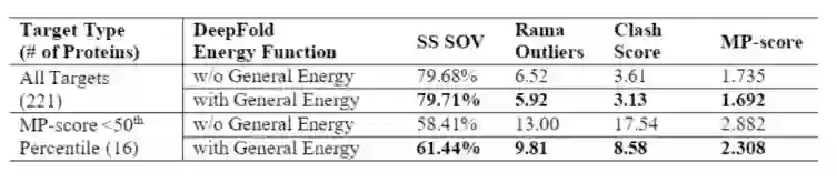 下图为一个来自SCOPe蛋白d1xsza2的案例研究,其中的模型在包含和不包含物理能量函数的情况下生成。在没有GE函数的模型中,有几个残基直接相互重叠,导致严重的空间冲突。这些冲突通过加入GE得到解决,得到的模型MolProbity分数降低到1.624(第92百分位),冲突分数低至1.2。显然,仅仅满足深度学习提供的几何约束可能会导致模型在物理上不现实,而引入物理能量项可能会一定程度上缓解这一问题。