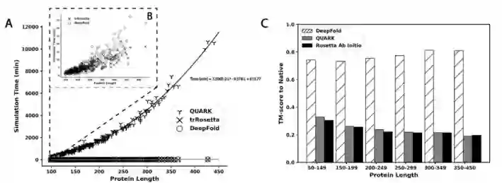 图7.模拟时间和TM评分与蛋白质长度的相关性