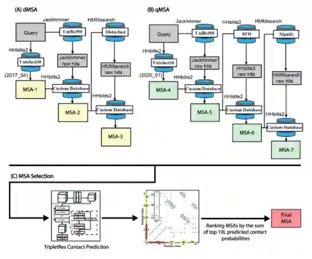 如下图所示,DeepMSA2通过迭代搜索全基因组(Uniclust30和UniRef90)和宏基因组(Metaclust, BFD和Mgnify)序列数据库来收集7个候选MSA。在dMSA阶段,目标序列首先由HHblits2通过Uniclust30(2017_04)进行搜索,以创建MSA-1。接下来,使用Jackhmmer和HMMsearch识别的序列构建一个自定义的HHblits数据库,从上一阶段生成的MSA开始运行HHblits2,分别生成MSA-2和MSA-3。剩下的四个MSA通过qMSA过程生成,使用HHblits2在Uniclust30数据库(版本2020_01)中搜索目标序列创建MSA-4。接下来,利用Jackhmmer、HHblits3和HMMsearch通过UniRef90、BFD和Mgnify数据库检测到的序列,构建自定义的HHblits数据库,利用HHblits2从前一阶段生成的MSA开始搜索,分别创建MSA-5、MSA-6和MSA-7。为了选择最终的MSA,从7个MSA开始运行一个快速TripletRes接触映射预测,具有最高累积概率的MSA将作为最终的MSA。