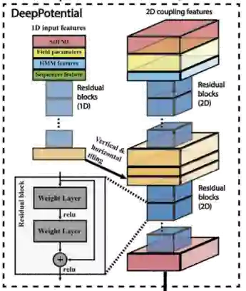 从选定的MSA开始,提取两组一维和二维特征。二维特征包括通过伪似然最大化(PLM) 得到的22-state Potts模型的原始耦合参数和原始互信息(MI)矩阵,其中Potts模型的22个状态代表20个标准氨基酸、一个非标准氨基酸类型和一个gap状态。在DeepPotential中,CCMpred被用来拟合Potts模型。PLM和MI矩阵中每个残基对的对应参数被提取为额外的特征,用于测量MSA中特定目标的协同进化信息。一维特征包含Potts模型字段参数、隐马尔可夫模型(HMM)特征和自互信息,以及MSA的one-hot编码和其他描述符。接下来,这些一维和二维特征分别被输入残差网络,其中每个特征分别通过一组一维和二维残差块,然后平铺在一起。平铺后的特征输入另一个残差网络,该神经网络输出残基间的相互作用项,包括Cα-Cα距离、Cβ-Cβ距离和残基间的方向。预测的空间约束用对应特定距离/角度值的bin表示, DeepPotential预测空间约束落在特定bin内的概率。DeepPotential模型的训练对象是从PDB收集的26151个非冗余蛋白。