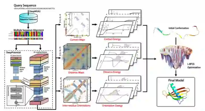 DeepFold是一种利用深度学习约束快速构建精确全长蛋白质结构模型的算法,包括三个主要步骤:由DeepMSA2生成MSA、由DeepPotential预测空间约束以及进行L-BFGS折叠模拟,如下图所示。