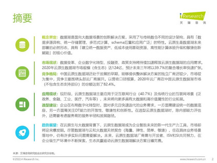 概念界定:数据湖是面向大数据场景的创新解决方案,云原生是数据湖未来部署的必然形态,具有「建立统一数据资产、低成本使用基础资源、高性能计算体验升级和敏捷创新赋能」的核心价值。 市场现状:2020年云原生数据湖市场规模(含生态)达124亿,预计未来三年将以39.7%的复合增长率快速扩张。 竞争格局:中国云原生数据湖还处于发展的早期,能够提供整体解决方案的独立厂商还较少,市场较为集中,竞争主要围绕头部云厂商展开。 应用现状:现阶段,云原生数据湖主要应用于泛互联网行业(40.7%)及传统行业的互联网场景(泛政务、金融、工业、医疗、汽车等),未来将向更多具有大数据和高价值属性的行业拓展。 选型建议:企业在布局数字化转型时,面对多元且快速迭代的业务需求,一方面需建设统一的数据底座,另一方面需关注DT能力的开放性、敏捷性和创新性。在选型云原生数据湖时,除内部能力评估外,还需要考虑服务商的服务半径和发展路径。 趋势展望:在云原生与大数据背景下,云原生数据湖成为企业智胜未来的新一代生产力工具,市场即将迎来爆发期。未来,云原生数据湖厂商需与开发者、ISV和SI共同努力,在企业级生产环境中不断探索,生态共赢驱动云原生数据湖解决方案日臻完善。
