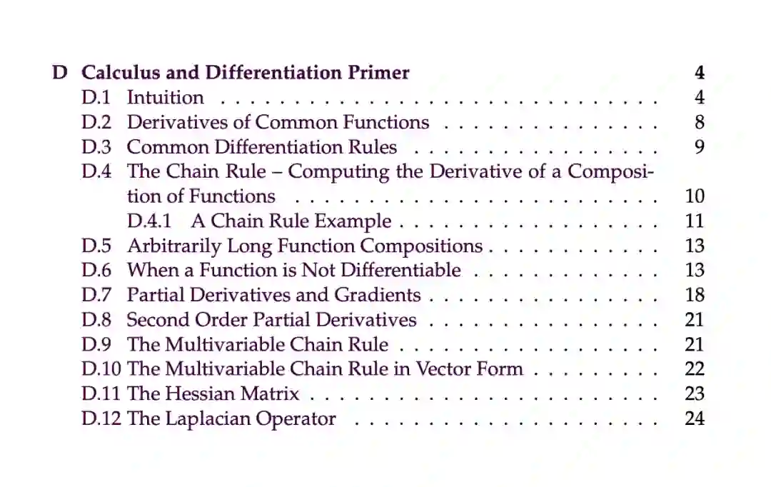 附录 D 集中讨论了与机器和深度学习最相关的微积分子领域:微分学。简单来说,微分学的重点是瞬时变化率或计算线性函数的斜率。这部分内容回顾了计算带有一个或多个参数的函数的导数的基本概念。此外还包括复习链式规则的概念,在机器学习中,它常被用来计算复合函数的导数的规则。 对于《人工神经网络和深度学习简介:Python 应用实用指南》这本书,Sebastian Raschka 的定位是「继续《Python 机器学习》中断的地方,并在 TensorFlow 中实现深度学习算法」。