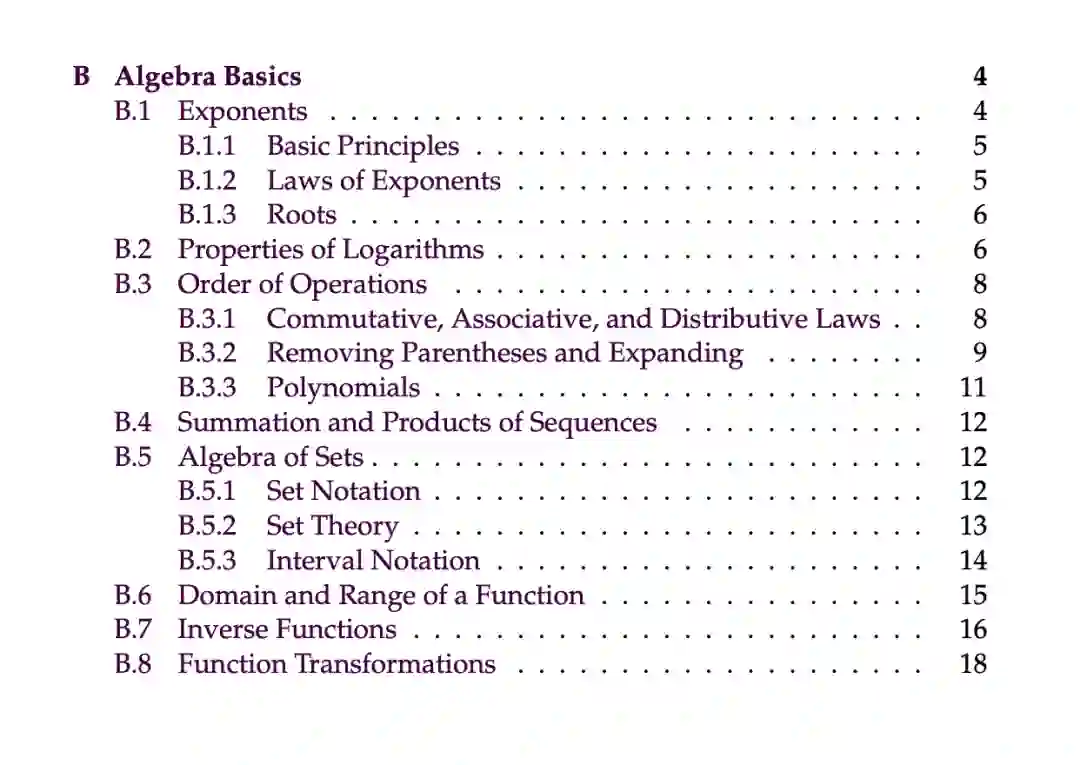 附录 B 中对与机器学习算法背后的数学相关的基本代数概念进行了回顾。代数是数学的一个分支领域,它使用数字和字母(或符号)来描述关系。代数经常被用来解决至少有一个量是未知的或可能变化的问题(通常称之为变量)。简单地说,我们可以把代数看作是一种结合了字母、符号和数字的语言,用来概括算术运算和解决带有变量的方程式。 作者提示,虽然本附录的目的是让读者了解代数基础知识,但它并非一个全面的代数资源。如果你想更深入地学习代数,可以参考更全面的资源,比如 Tyler Wallace 的《初级和中级代数》。