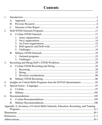 2018年美国国防战略强调,由于新技术的 "无情"发展,安全环境正在迅速变化。随着这些新兴技术在未来战争中变得越来越重要,美国国家安全界必须投资扩大具有必要的关键技能的个人群体,以应对这种以技术为中心的新环境的挑战。为了实现这一目标,美国国防部实施了一些外联计划,针对从小学到大学和研究生课程的学生,鼓励他们考虑在科学、技术、工程和数学(STEM)领域的职业。同样,国防部也投资了许多招聘计划,包括实习、奖学金和招聘会。这些对关键技能的宣传、教育和招聘的投资也必须与私营部门对许多相同技能不断增长的需求相竞争。