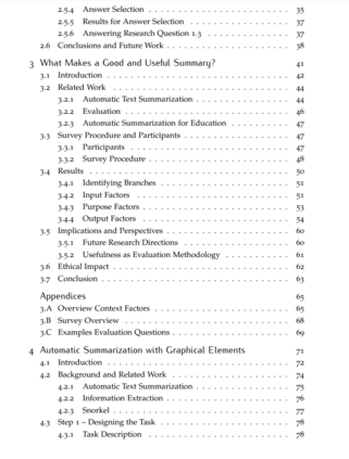 为了回答这个研究问题,我们提出了一种调查方法,用来研究预制摘要的用户的需求,即,由其他人编写的摘要 —— 这也是自动生成摘要所属的类别。我们的调查可以在设计和开发自动摘要方法之前用来确定用户的期望。接下来,评估实现的方法是否确实符合用户的需求是很重要的。因此,我们还提出了一个评估方法,用来评估自动生成摘要对用户的实用性。我们的调查可以轻易地适应不同的用户群体,我们选择大学生作为我们的第一个目标群体。我们发现,目前的自动摘要方法并不总是符合参与者对预制摘要的期望。这些方法的大部分旨在生成几句话长的摘要,以原始文本格式(例如,See等人,2017; Narayan等人,2018b; Liu和Lapata,2019; Lewis等人,2020)。然而,纯原始文本的摘要在我们的调查参与者中并不受欢迎。相反,参与者表明需要包含各种图形元素的摘要,例如,箭头或彩色文本。这一发现激发了我们的下一个研究问题: