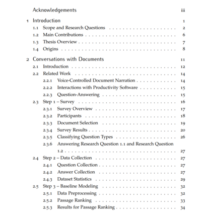 研究问题1:以文档为中心的协助是什么样的,我们应该如何建模它?为了回答这个研究问题,我们首先进行一项调查,探索人们在以文档为中心的情境中可能提出的问题。一旦我们对人们希望得到的协助类型有了充分的理解,我们就进入一个更大的数据收集阶段。我们收集了一个以文档为中心的协助背景下的人工标注的英语数据集,包括问题和答案。接下来,我们进行建模步骤,目标是将模型与用户在以文档为中心的场景中确定的需求相对应。我们展示了早期的问答模型在以文档为中心的场景中取得了有希望的结果,但我们也发现,与其在更标准的问答任务上的表现相比,还存在着较大的差距。因此,这项工作也帮助我们理解问答模型的能力,并确定这些模型还可以在哪些地方进行改进。我们现在继续在自动文本摘要的领域进行研究。我们的动机来自于观察到自动摘要方法经常优化自动度量如Rouge (Lin, 2004) 和人类评估度量如信息量、流畅度、简洁性和真实性(例如,Lin, 2004; Nenkova和Passonneau, 2004; Paulus等人,2018; Narayan等人,2018b; Goodrich等人,2019; Wang等人,2020; Xie等人,2021)。通常,摘要的用户并没有明确地纳入到自动摘要方法的设计过程中,使得我们很难判断这些摘要是否完全符合用户的需求。这激发了我们的下一个研究问题: