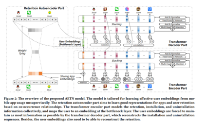 在本文中,我们报告了我们最近在腾讯基于移动应用使用的用户建模的实践。用户对移动应用的使用行为,包括保留、安装和卸载,可以很好地反映用户的长期和短期兴趣。例如,如果用户最近安装了Snapseed,她可能对摄影越来越感兴趣。这些信息对于许多下游应用程序是有价值的,包括广告、推荐等。传统上,基于移动应用程序使用情况的用户建模很大程度上依赖于手工制作的特征工程,这需要对不同的下游应用程序进行繁重的人工工作,如果没有领域专家的话,可能不是最优的。然而,基于移动应用使用的自动用户建模面临着独特的挑战,包括(1)保留、安装和卸载异构,需要集中建模,(2)用户行为随时间分布不均,(3)许多长尾应用存在严重的稀疏性。在本文中,我们提出了一个定制的自编码器耦合Transformer 网络(AETN),通过它我们克服了这些挑战,并实现了减少人工劳动和提高性能的目标。我们在腾讯部署了该模型,从下游应用的多个域进行的在线/离线实验都证明了用户嵌入输出的有效性。