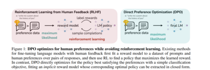 虽然大规模无监督语言模型(LMs)学习了广泛的世界知识和一些推理技能,但由于其训练的完全无监督性质,要精确控制它们的行为是困难的。现有的方法为了获得这种可操控性,会收集人类对模型生成内容相对质量的标签,并对无监督LM进行微调,使其与这些偏好一致,这通常涉及到利用人类反馈的强化学习(RLHF)。然而,RLHF是一个复杂且经常不稳定的过程,首先拟合一个反映人类偏好的奖励模型,然后使用强化学习对大型无监督LM进行微调,以最大化这个估计的奖励,同时不过分偏离原始模型。在本文中,我们介绍了RLHF中奖励模型的一种新参数化,它能够以闭合形式提取相应的最优策略,使我们能够仅使用简单的分类损失来解决标准的RLHF问题。由此产生的算法,我们称之为直接偏好优化(DPO),稳定、高效能、计算轻量,消除了在微调过程中从LM采样或进行大量超参数调整的需要。我们的实验表明,DPO可以微调LMs以与人类偏好一致,其效果与现有方法相当或更好。值得注意的是,使用DPO进行微调在控制生成内容的情感方面超过了基于PPO的RLHF,并且在摘要和单轮对话的响应质量方面达到或提高,同时在实现和训练上大大简化。