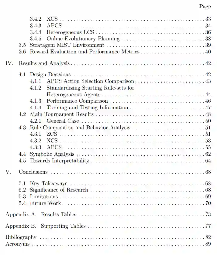 这篇论文的重点是LCS在回合制、同时移动和多行动游戏Stratagem MIST中的实现。Stratagem MIST是空军研究实验室(AFRL)正在开发的一个游戏,作为战时冲突的多域模拟器。据作者所知,专门用于军事战争游戏的LCS Agent目前还没有被探索。此外,在一般的游戏中缺乏涉及匹兹堡式的LCS的研究,这也提供了一个兴趣点和未开发的领域。我们的假设是,LCS,特别是匹兹堡式LCS,除了产生可解释的输出,可以让外部观察者理解其决策过程外,还可以成为Stratagem MIST的有效的符号游戏Agent。