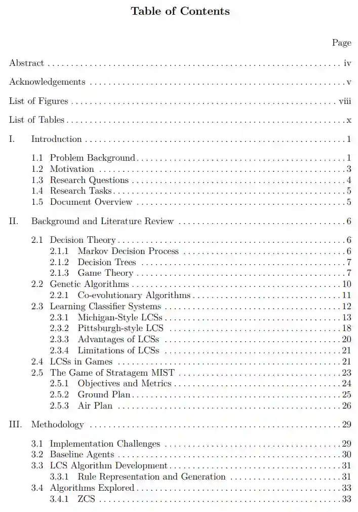 第二章介绍了博弈论的概念,LCS研究的概述,以及Stratagem MIST的描述。第三章概述了为回答研究问题所实施的工作。第四章分析和讨论了所得数据。最后,第五章提出结论并讨论了未来的工作。