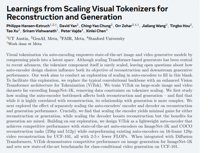 为了促进这一探索,我们用增强版视觉Transformer架构(ViTok)替代了典型的卷积骨干网络进行分词。我们在超越ImageNet-1K的大规模图像和视频数据集上训练ViTok,消除了分词器扩展中的数据限制。我们首先研究了扩展自编码器瓶颈如何同时影响重建和生成——结果发现,尽管扩展与重建高度相关,但其与生成的关系则更为复杂。接着,我们探索了分别扩展自编码器的编码器和解码器对重建和生成性能的影响。关键发现是,扩展编码器对重建和生成的提升几乎微乎其微,而扩展解码器则显著提升重建性能,但对生成的效果则是喜忧参半的。