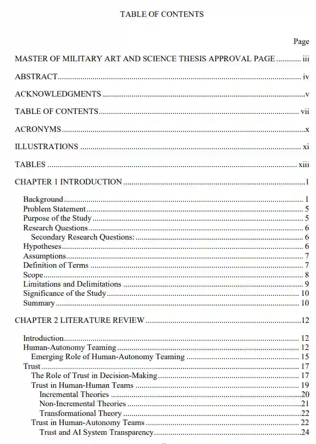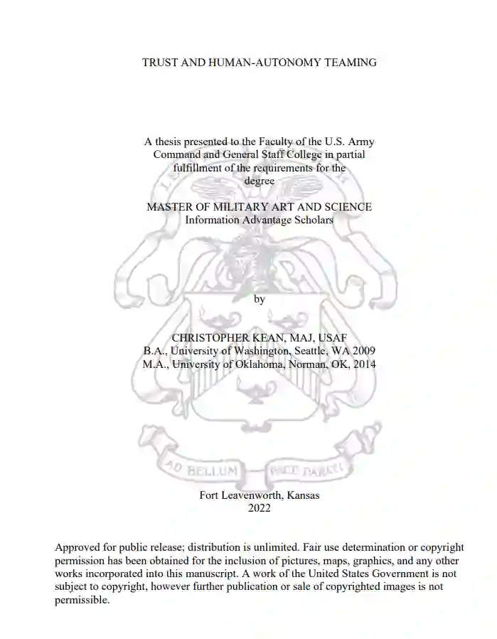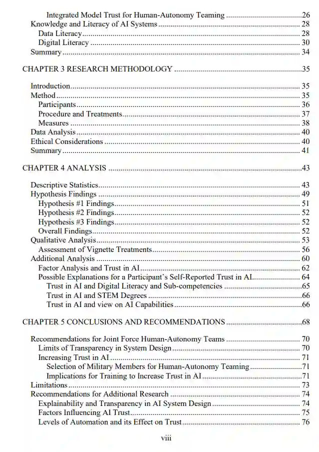 这篇研究论文的目的是研究什么会影响人类的信任,因为它与人类-自主性协作有关。该研究是通过一个在线调查实验进行的混合方法研究。该实验分析了几个自变量和一个因变量(对人工智能(AI)系统的信任)。自变量是个人的数字素养,人工智能系统的透明度,以及参与者对人工智能系统的能力/性能的经验水平。用随机的处理方法来测量自变量,参与者在其中扮演了一个与人工智能系统配对运营团队中的首席规划师角色。结果显示,无论处理条件如何,对人工智能的基本信任水平的重要性。最后,该研究强调,人工智能系统增加信任的透明度可能比以前认为的更有限。