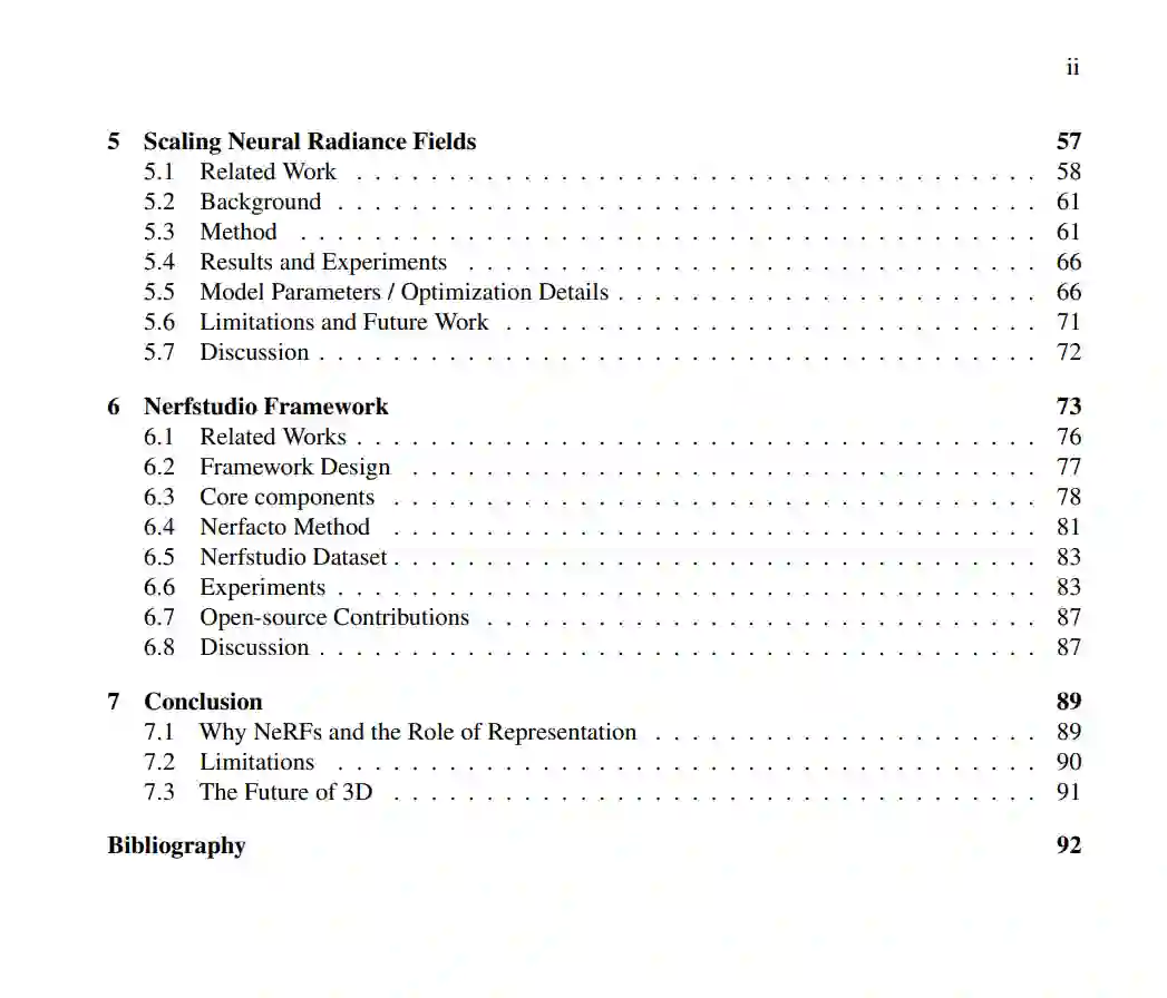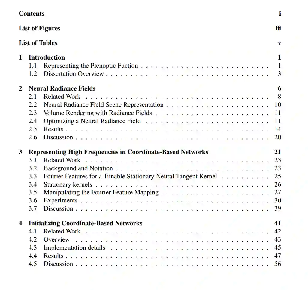 这篇博士论文探索了通过优化体积场景函数使用稀疏输入视图合成复杂场景的新视图。我们的方法将场景表示为神经辐射场(NeRF),这是一个基于5D坐标的密度和辐射场,包括空间位置(x, y, z)和观察方向(✓, )。NeRF使得渲染超越以往技术的逼真的新视图成为可能,引发了计算机视觉和图形社区的众多后续研究和扩展。为了增强NeRFs中高频细节的表示,我们引入了一种傅里叶特征映射技术,有效地在低维问题域中学习高频函数,包括NeRF。我们通过标准的元学习算法演示了利用学习到的初始权重参数的好处,导致了坐标基网络的加速收敛、更强的先验和改善的泛化。此外,我们通过一种能够表示任意大场景的提议方法改善了NeRFs的可扩展性。这种方法使得能够使用在多种环境条件下捕获的数据进行城市规模的重建。最后,我们介绍了Nerfstudio框架,这是一套为开发和部署基于NeRF的方法而设计的全面的模块化组件和工具。这个框架赋予了研究者和实践者实时可视化、流线化的数据管道和导出能力,促进了NeRFs的民主化,并扩大了它们在研究环境之外的影响。随着它们改变计算机图形、虚拟现实、增强现实和其他领域的潜力,NeRFs有望革新我们感知和互动的数字世界的方式。