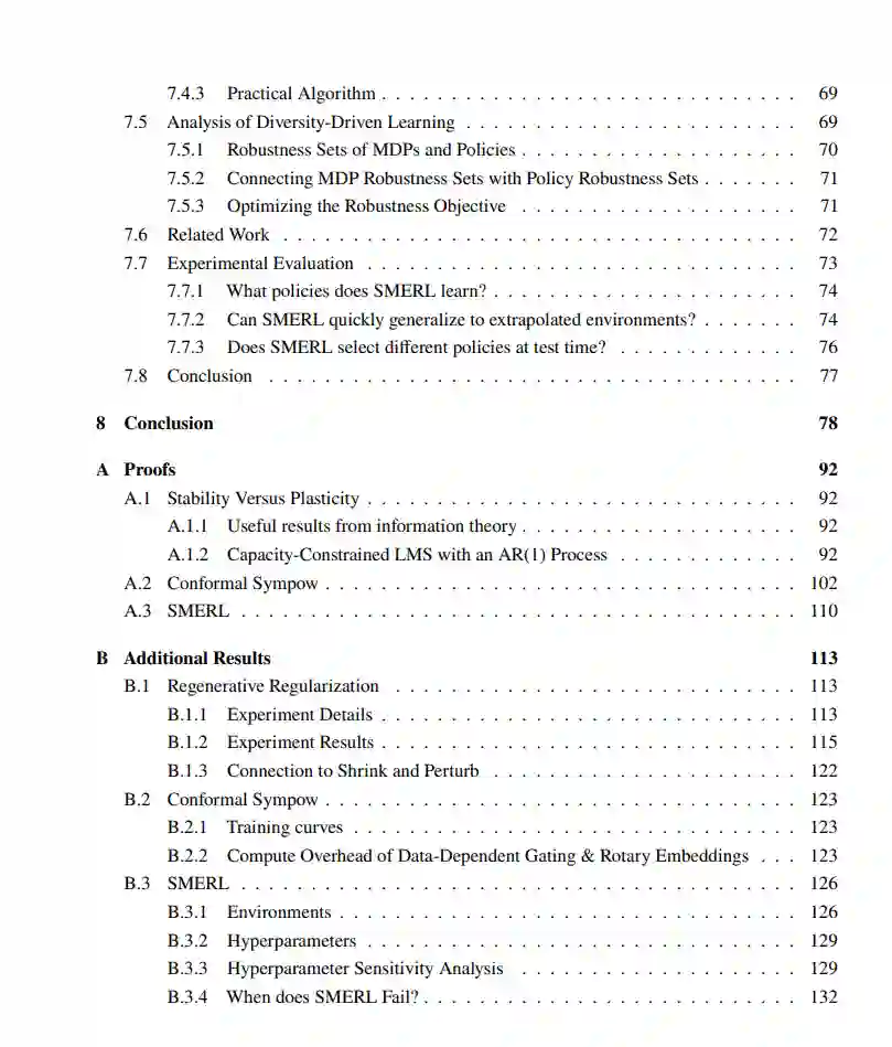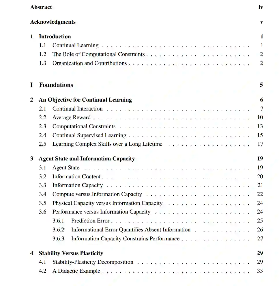 持续学习依然是机器学习领域的一项长期挑战。成功实现持续学习需要不断吸收新的知识,同时保留仍然有用的旧知识。在本论文中,我们提出了一种连贯的持续学习目标:在每个时间步受到计算资源限制的前提下,最大化无限时域平均回报。这一框架使我们能够系统性地分析持续学习智能体的设计与评估,超越仅仅依赖准确率保持或可塑性等零散指标的方法。 论文的第一部分聚焦于基础工具与理论视角的构建,包括:对智能体状态的信息论建模、智能体容量的量化方法,以及持续学习中稳定性–可塑性权衡的形式化定义。第二部分则提出了多种新算法:一种用于缓解神经网络可塑性退化的再生式正则化方法;Conformal Sympow——一种基于Transformer的模型,借助学习型门控与数据依赖旋转机制,实现了高效的长上下文推理;以及一种以多样性驱动的强化学习方法,使智能体具备对环境扰动的少样本鲁棒性。