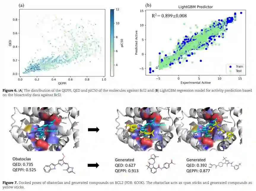 基于配体的生成分子案例 为了评估基于配体生成的化合物是否可以成为良好的候选分子,研究人员选择了基于 obatoclax 的生成 Bcl2 靶标的潜在候选抑制剂。BCL-2 蛋白家族通过控制线粒体外膜的完整性在调节细胞死亡中起关键作用。促凋亡 BCL-2 家族蛋白,如 BAK 和 BAX,在细胞凋亡中具有重要作用。当这些蛋白质被抗凋亡结合伙伴(如 BCL-2 和 BCL-XL)隔离时,它们的作用就会被阻断。通过与抗凋亡 BCL-2 家族蛋白结合来破坏这种相互作用的小分子已被设计用于诱导癌细胞的凋亡。相关的 PPI 专门针对 Bcl-2 家族蛋白,因为 Bcl-2 家族成员之间的所有相互作用都是通过 PPI。目前正在临床试验中测试三种 Bcl-2 家族 PPI 干扰物(即 navitoclax、obatoclax 和 Venetoclax)。研究人员收集针对 Bcl2 的生物活性数建立LightGBM回归模型用于针对 Bcl2 靶标的活性预测。分子指纹和分子描述符作为特征输入,IC50(nM)的自然对数作为标签,IC 50小于 100 000 nM 的值被定义为活性分子。然后使用 LightGBM 回归模型来估计生成的分子是否对 Bcl2 具有生物活性。此外,通过 QEPPI 值 > 0.5 和 SA 得分值 <4 过滤化合物后,有 44 种化合物被命中。为了进一步优先考虑用于生物测定的分子,选择性 Bcl-2 抑制剂 obatoclax 作为参考化合物,并通过对接预测结合亲和力。结果表面,其中15 种具有比参考化合物更高的对接分数和 QEPPI值。