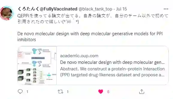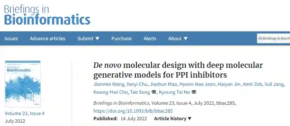 参考资料 Jianmin Wang, Yanyi Chu, Jiashun Mao, Hyeon-Nae Jeon, Haiyan Jin, Amir Zeb, Yuil Jang, Kwang-Hwi Cho, Tao Song, Kyoung Tai No, De novo molecular design with deep molecular generative models for PPI inhibitors, Briefings in Bioinformatics, Volume 23, Issue 4, July 2022, bbac285 https://doi.org/10.1093/bib/bbac285