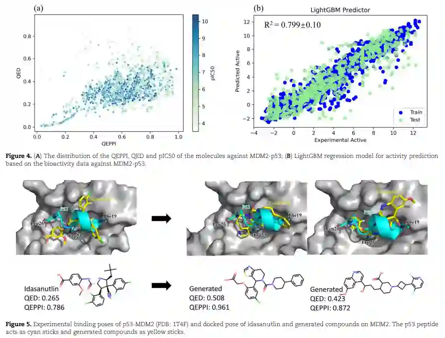 基于肽的生成分子案例 为了评估基于肽生成的化合物是否可以成为有效的候选分子,研究人员选择了基于p53(肽)生成 MDM2-p53 靶标的潜在候选抑制剂。p53 是一种有效的肿瘤抑制因子,是癌症治疗的一个有吸引力的靶标,因为它可以在功能上被激活以根除肿瘤。编码 p53 蛋白的基因在一半的人类癌症中发生突变或缺失,从而使肿瘤抑制因子的活性失活。阻断 MDM2-p53 相互作用以重新激活 p53 的功能是一种很有前景的癌症治疗策略。研究人员收集针对 MDM2-p53 的生物活性数据开发了一种用于活性预测的LightGBM回归模型,然后使用 LightGBM 回归模型来预测生成的分子是否对 MDM2-p53 PPI 靶标具有生物活性。此外,通过 QEPPI 值 > 0.5 和 SAscore值 <4 过滤化合物后,有 243 种化合物被命中。为了进一步确定优先考虑用于生物测定的分子,研究人员使用DOCK6进行分子对接来预测结合亲和力。分子对接结果显示,研究人员找到了 10 种具有比参考化合物更高的对接分数和 QEPPI 值的化合物。