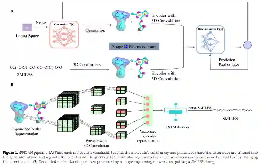 模型架构 PPI 抑制剂的深度分子生成模型包括两个主要步骤:(i) GAN 使用 3D 卷积神经网络 (CNN) 来捕获分子表示,(ii) 组合CNN 和LSTM网络从分子表示中解析 SMILES。分子形状和药效团表示用作 GAN 的输入,然后是字幕网络将分子形状和药效团表示解析为 SMILES 字符串,生成与配体表示匹配的分子。
