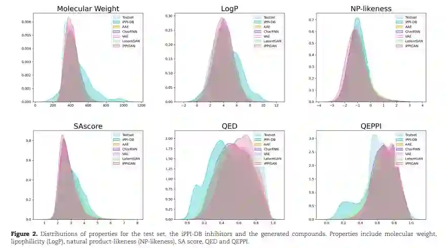 研究人员比较了六种分子性质的分布,即 iPPI-DB 抑制剂以及AAE、CharRNN、VAE、LatentGAN 和 iPPIGAN 生成的分子集。如图2所示,iPPIGAN生成的分子的性质分布与测试集的性质分布接近。iPPIGAN 模型生成的分子的性质分布与 iPPI-DB 抑制剂的不同,主要是因为训练数据集的性质分布与 iPPI-DB 抑制剂的不同。此外,与其他模型相比,iPPIGAN 生成的分子具有更高的 QED 值、更高的 QEPPI 值和更低的 SA 分数。结果表明,iPPIGAN生成的分子易于合成,具有更好的药物相似性和PPI靶向药物相似性。由于构建的训练集具有较高的药物相似性,该模型可以更好地学习药物相似性分布并扩展到新的药物相似性空间。