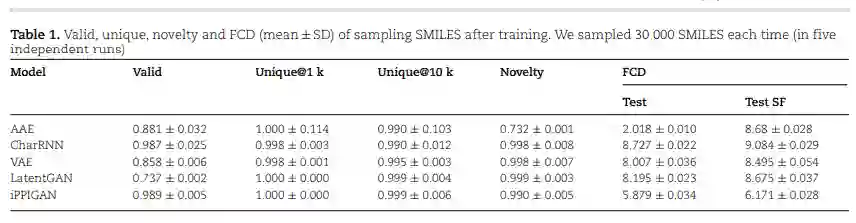 所提出的 iPPIGAN 模型优于其他具有相似或高百分比的有效、独特和新颖的 SMILES 字符串的生成模型。在 FCD 方面,研究人员开发的模型优于大多数其他方法。