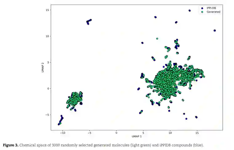 作者构建了一个蛋白质-蛋白质相互作用(PPI)靶向药物相似性数据集,并提出了一个首次用于PPI抑制剂设计的深度分子生成框架,从种子化合物的特征生成新的类药性分子。该框架使用与PPI抑制剂相关的关键特征作为输入,并为PPI抑制剂的从头分子设计开发深度分子生成模型。首次将针对PPI的抑制剂的定量类药性指标QEPPI用于PPI靶向化合物的分子生成模型的评估。结果表明生成的分子具有较好的PPI靶向药物的类药性。此外,通过化学空间分析,生成的分子与iPPI-DB抑制剂共享化学空间。