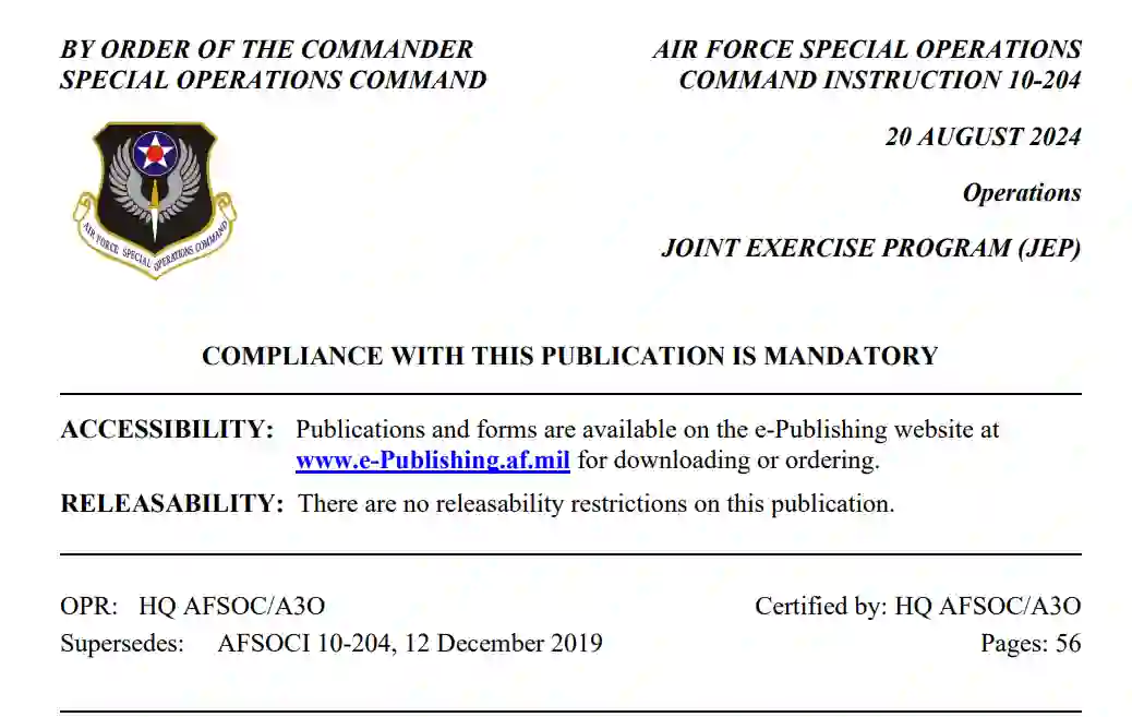 本指令执行美空军部政策指令(DAFPD)10-2 “战备 ”和空军指令(AFI)10-204 “空军军种演习计划及对联合和国家演习计划的支持”。它定义了空军特种作战司令部(AFSOC)联合演习计划(JEP),并就预算编制、后勤、部队管理、准备和执行演习活动(包括参谋长联席会议(CJCS)主席批准的国家联合训练能力(JNTC)、军种演习和战区安全合作(TSC)活动)为 AFSOC 部队提供指导。它还为美国空军司令部(AFSOC)参与联合演习计划(JEP)和国家演习计划(NEP)提供指导,并涉及国防部(DoD)训练转型(T2)计划的作战指挥官演习和参与(CE2)部分。它提供了演习指南和责任,并建立了监督和管理美国海军陆战队支持和参与这些演习的工具。它概述了与演习周期相关的主要行动。它将 AFSOC A3 定义为规划、组织和执行空军指挥官的军种、联合和联合演习以及 TSC 计划的主要协调中心。本出版物适用于AFSOC总部、AFSOC下属单元、AFSOC现役人员和文职人员,以及有合同义务遵守DAF发布条款的人员。本刊物适用于获得空军后备司令部(AFRC)和空军国民警卫队(ANG)单元的 AFSOC。本出版物不适用于美国太空部队。