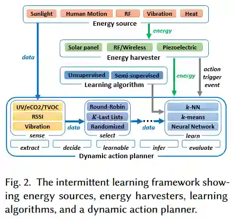 本文介绍了间歇学习,其目标是使获取的能量计算平台能够有效地执行某些类型的机器学习任务。我们确定独特的挑战断断续续学习有关机器学习的数据和应用程序语义任务,为应对这些挑战,我们设计一个算法来决定一系列的行动,以达到预期的学习目标能源紧缩的情况下,和2)提出三个启发式帮助断断续续学习者决定是否学习或丢弃训练实例在运行时,会增加系统的能源效率。我们分别使用太阳能、射频和动能收割机来实现和评估三种间歇学习应用:1)空气质量、2)人类存在、3)振动。我们证明,与目前最先进的间歇计算系统相比,该框架可将学习者的能源效率提高100%,并将学习实例的数量减少50%。